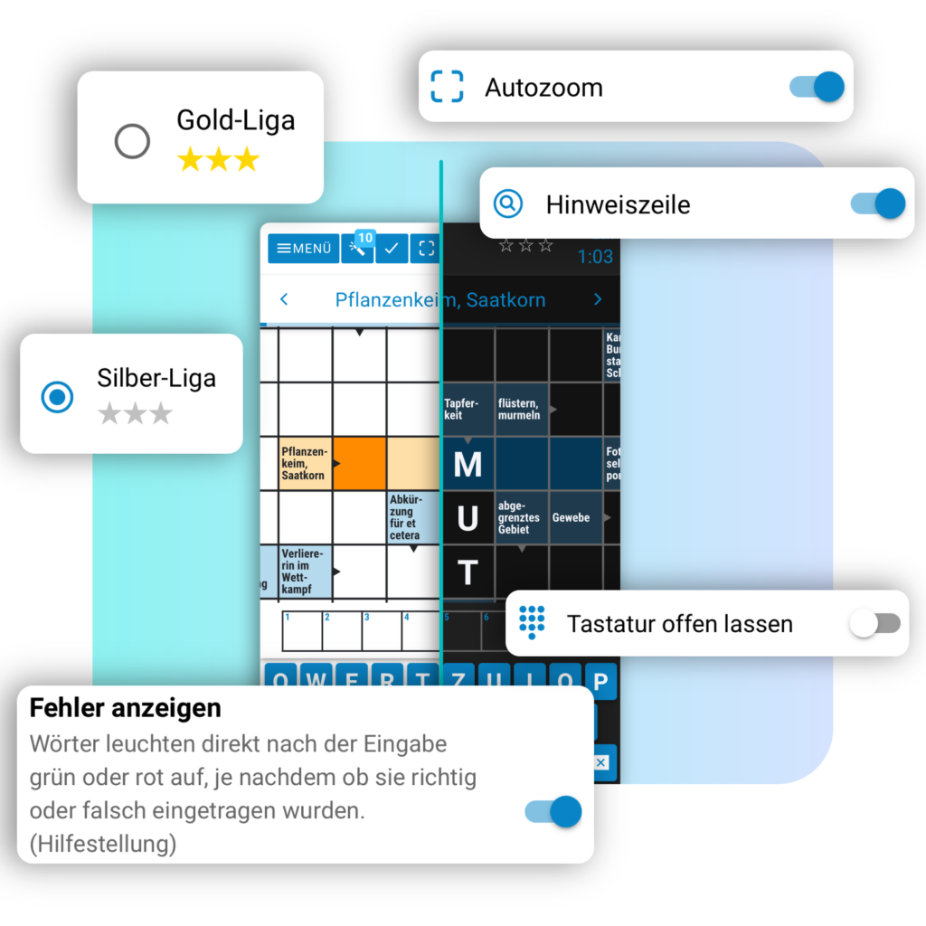 Unsere Spiele sind standardmäßig mit zahlreichen Features ausgestattet, darunter ein betriebssystemsensitiver Light-/Dark-Mode und Autozoom für optimalen Bedienkomfort. Darüber hinaus ermöglichen Erweiterungen wie Ranglisten und flexible Hilfestufen ein individuell anpassbares, ansprechendes und benutzerfreundliches Spielerlebnis.