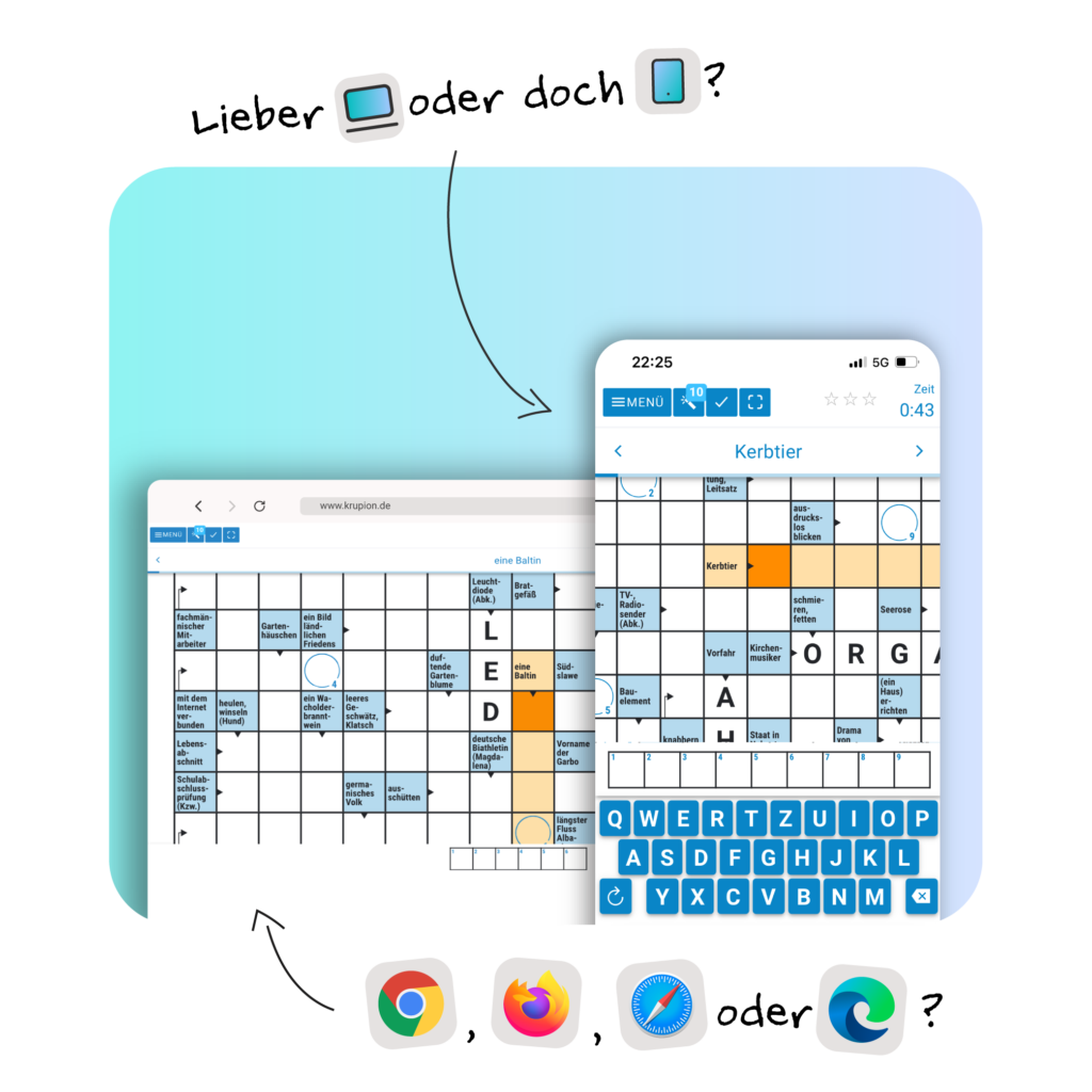 Unsere Rätsel bieten ein optimales Spielerlebnis auf allen Geräten – vom Smartphone bis zum Desktop-PC. Die geräte- und browserunabhängige Umsetzung gewährleistet Anpassung an jede Bildschirmgröße ohne Kompromisse bei Design oder Funktionalität, für maximalen Spielkomfort und breite Zugänglichkeit für alle Zielgruppen, egal ob unterwegs oder zu Hause. So erreichen Sie Ihre Kundinnen und Kunden immer dort, wo sie gerade sind.